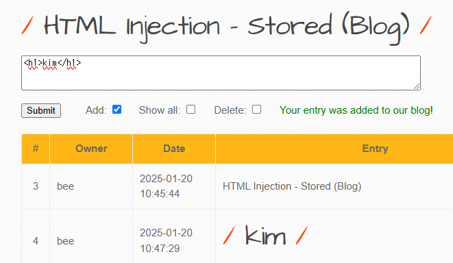 http://192.168.0.17/bWAPP/htmli_get.php?firstname=<h1>kim</h1>&lastname=<h2>jisu</h2>&form=submit