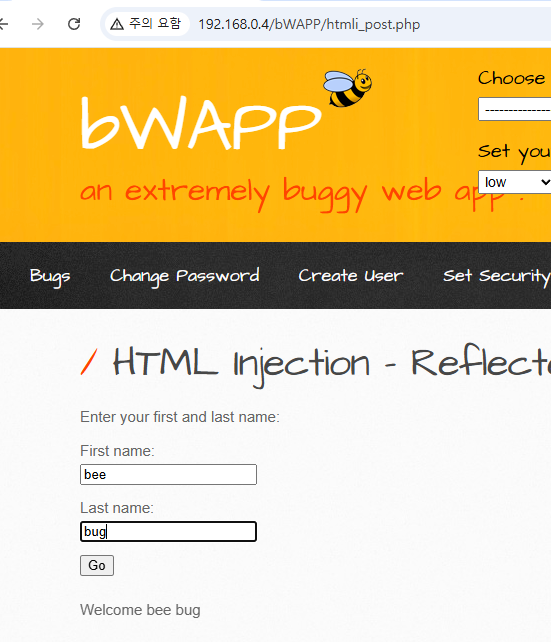 처음 화면에 들어가면 URL에 아무것도 없고 http://192.168.0.17/bWAPP/htmli_get.php 로만 써 있다.