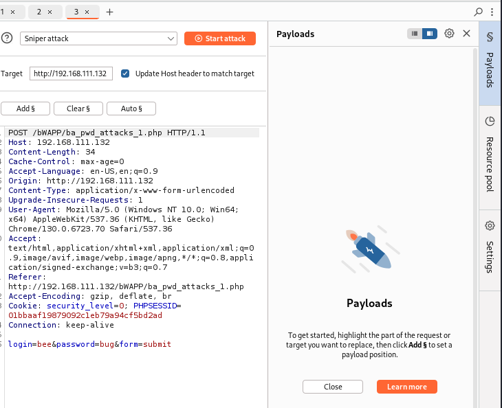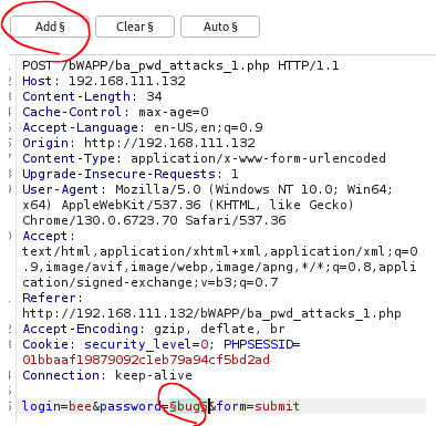 들어가 보면 이런 형식으로 구성 되어 있는데 brute force 공격을 할 위치를 드래그 해서 add$를 눌러주면 해당 부분만 brute force 공격을 시도한다