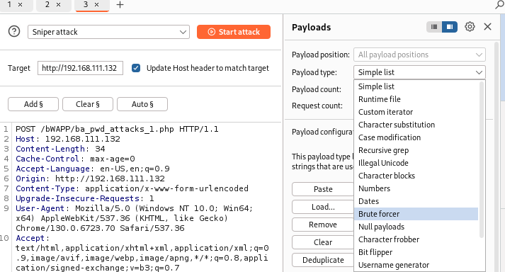 그럼 페이로드 창이 나오는데 payload type에 brute forcer 를 선택해준다